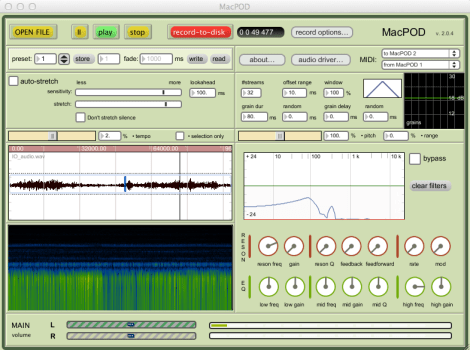 I used a demo version of a piece of software called MacPOD which is a standalone granular synthesiser which is quite simple to use and produces some very interesting and high quality results. The four files below are from my first experiment with this.