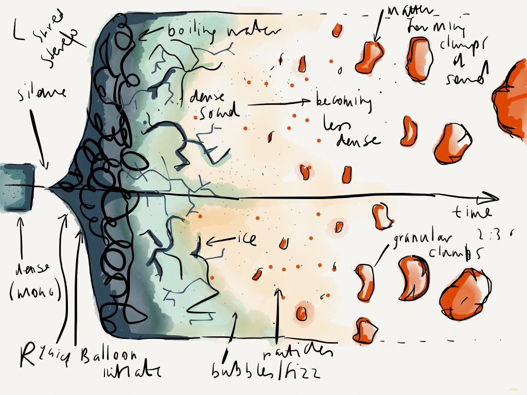 The work crosses the boundaries between composition and sound design. It is not composed in a traditional way, and doesn’t follow traditional compositional structures. The final piece will predominantly be created from sounds recorded using contact mics within an elemental theme. This image is a visual representation of what I would like the sound and shape of the work to be, which hopefully fits in with my intended project outcomes.