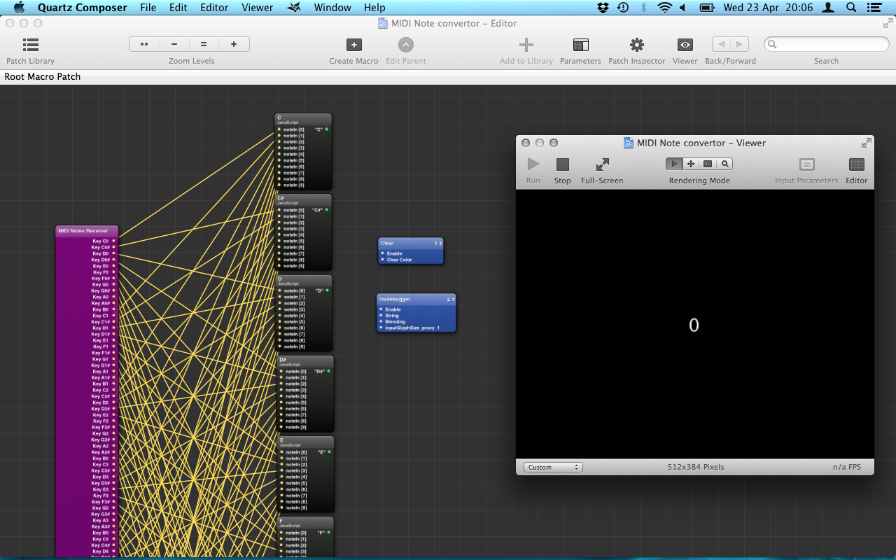 MIDI input to output Published April 23, 2014 at 1280 × 800 in Learning Quartz Composer – Initial Experiments ← Previous Next → MIDI input to output – maps each key from a MIDI keyboard to trigger images – in this simple examples, numbers. MIDI input to output – maps each key from a MIDI keyboard to trigger images – in this simple examples, numbers.