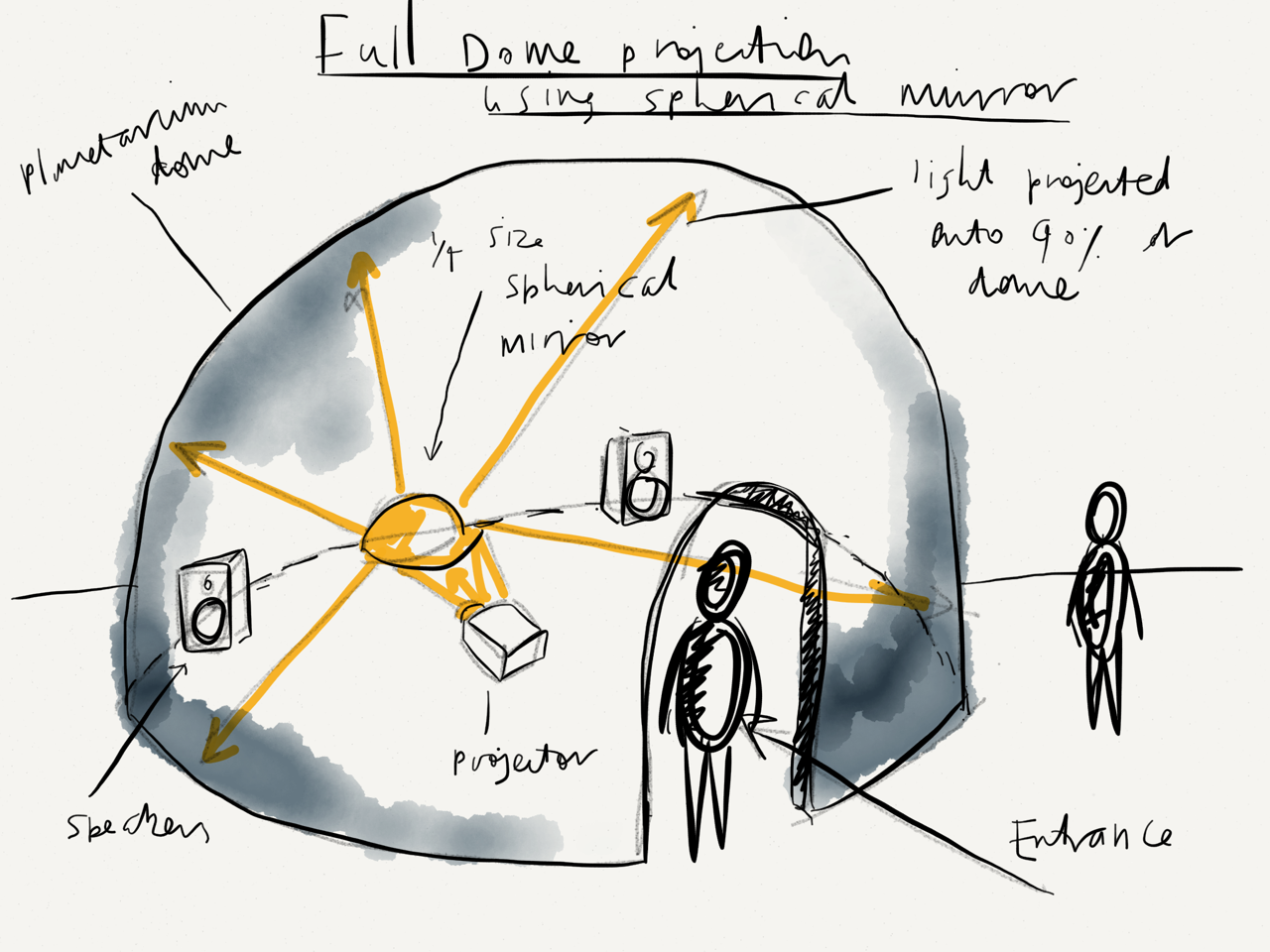 This concept focuses on form rather than content. I started to explore the avenue of 360˚ dome projection. There are two types of dome projection; the expensive digital dome projection system that utilises multiple projectors to fill the shape or the substantially cheaper option utilising a spherical mirror, 1 projector and software to warp the image. After following this avenue, costs proved prohibitive for both techniques. As far as form is concerned this would be perfect for the project and may be worth exploring further in the future.