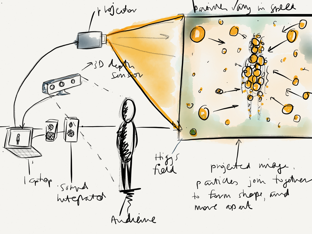 This idea is inspired by Thomas Young’s double-slit experiment. Again this idea is based on movement, by standing still in front of the depth sensor, piece-by-piece an image is built up from particles. This image will have a symmetrical “anti” image on the opposite side of the screen representing matter and anti-matter. This will be integrated with sound in conjunction with the image. The particles disperse when movement is detected.